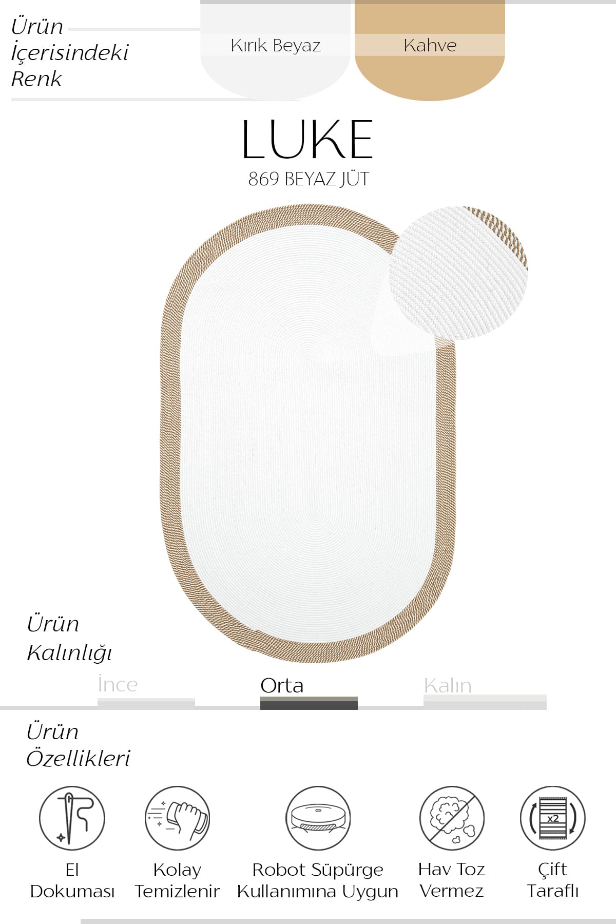LUKE 869 BEYAZ JÜT OVAL HALI