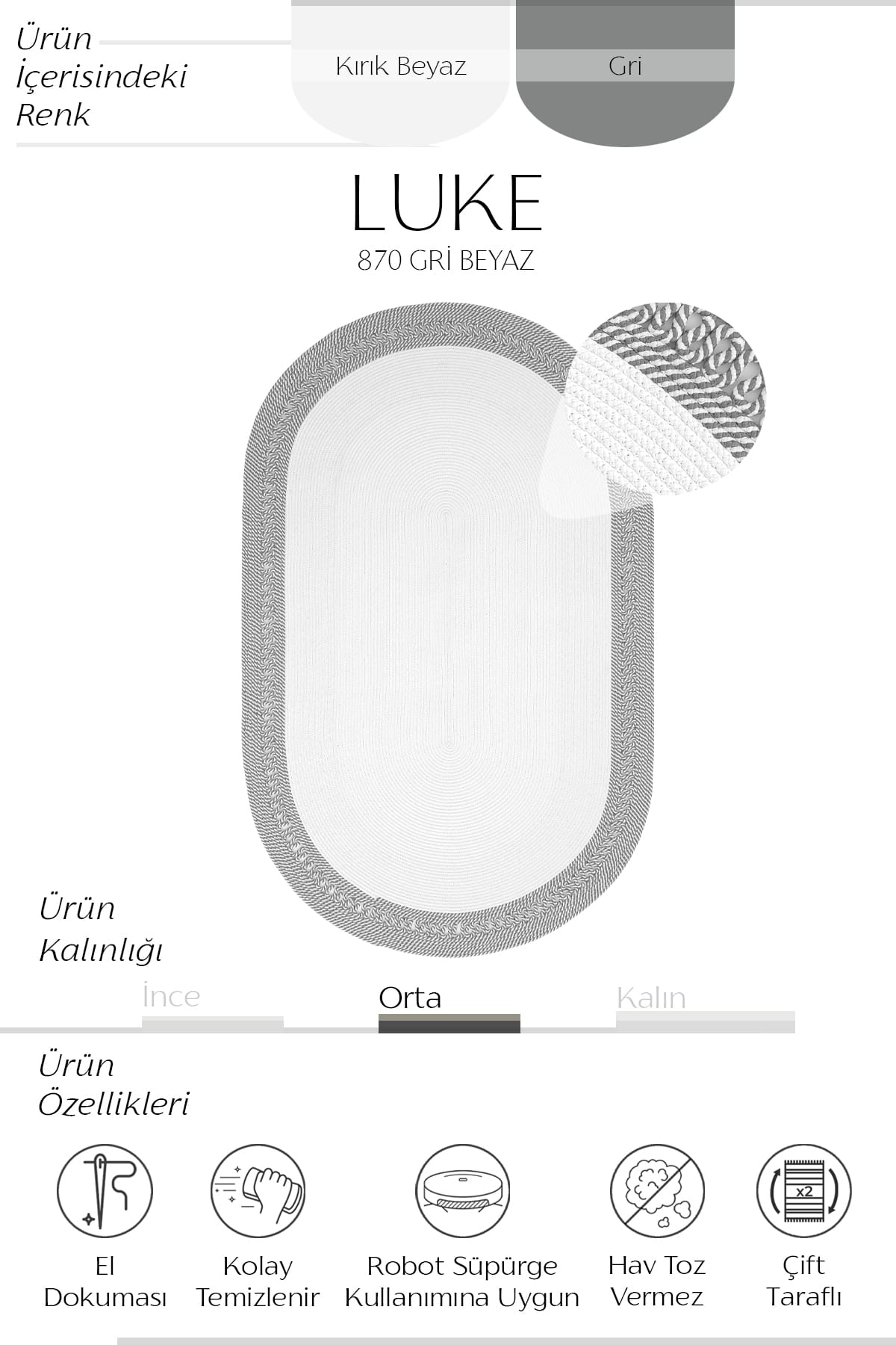 LUKE 870 GRİ BEYAZ JÜT OVAL HALI