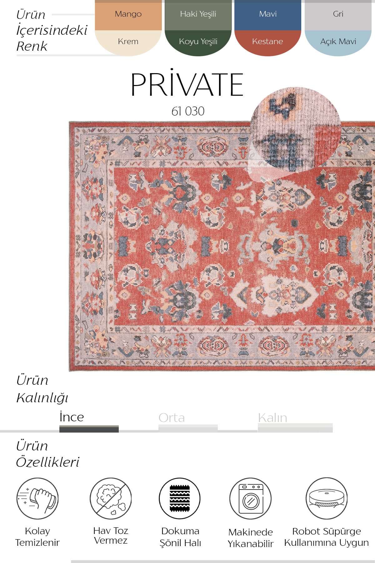- Boyut Farkı : Satın aldığınız üründe üretim ve kullanılan iplik çeşitliliğinden kaynaklı halıların eninde ve boyunda %5’e kadar farklılık görülebilir. ;