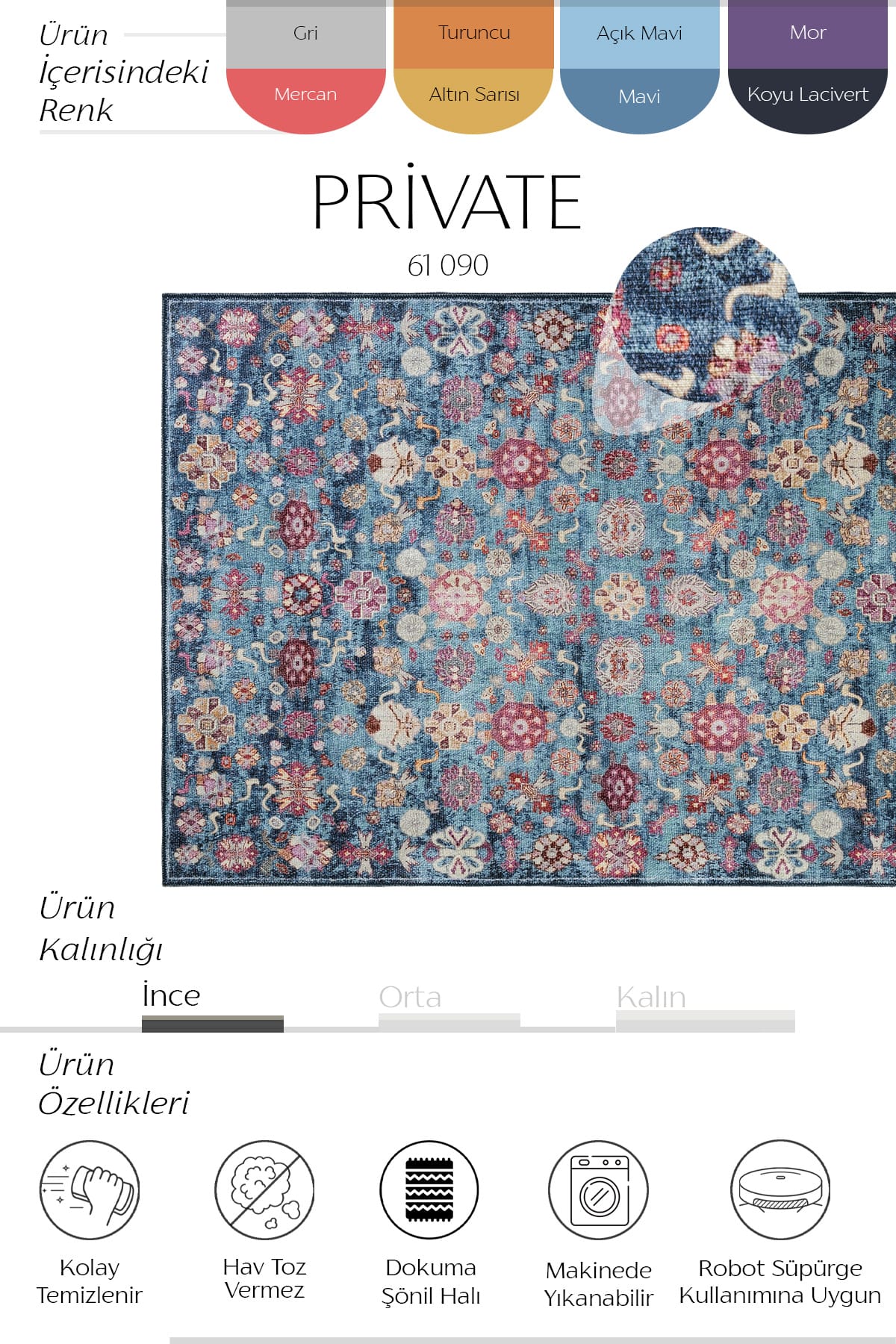 • Boyut Farkı : Satın aldığınız üründe üretim ve kullanılan iplik çeşitliliğinden kaynaklı halıların eninde ve boyunda %5’e kadar farklılık görülebilir. ;